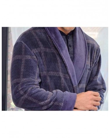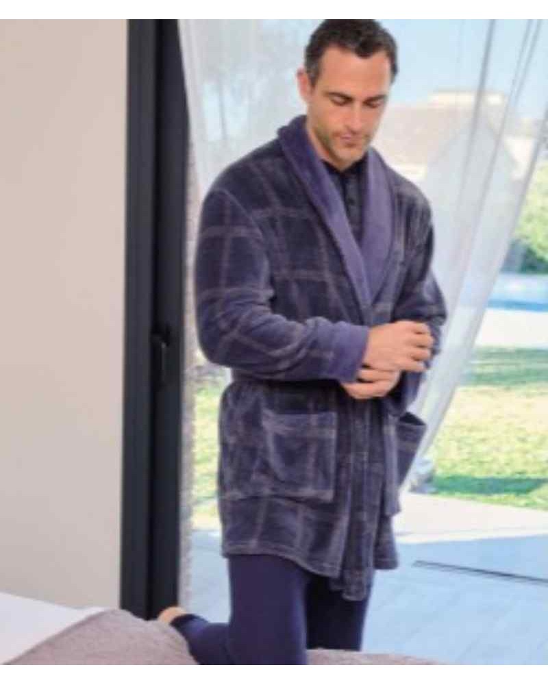 Bata de hombre corta, de invierno, en tejido cálido de coralina muy ligero y confortable. Cuello tipo esmoking y cierre cruzado con cinturón. Bolsillos laterales de plastón. Diseño estampados en cuadros. Ideal para estar en casa cómodo y calentito.