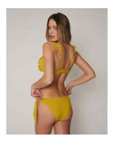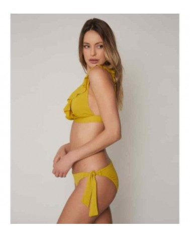 Bikini de mujer de la firma ADMAS en tono lima. Top de bikini de triágulo con detalle de volante. Tirantes ajustables. Relleno extraíble. Cierre con broche en la parte trasera. Banda inferior elástica. Braguita ajustable con lazos laterales.