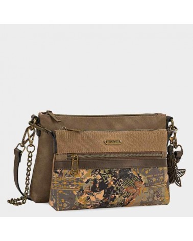 Bolso bandolera de mujer 2 en 1. Cartera delantera estampada de quita y pon. Múltiples departamentos. Detalle de llavero y diferentes asas, una en polipiel y otra de cadena.