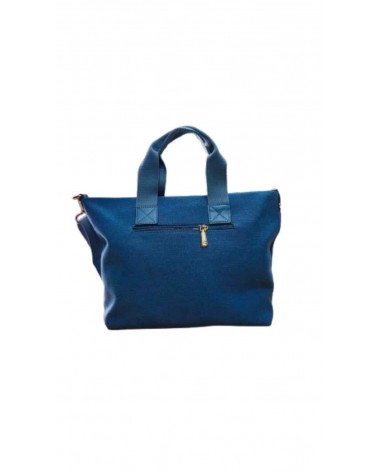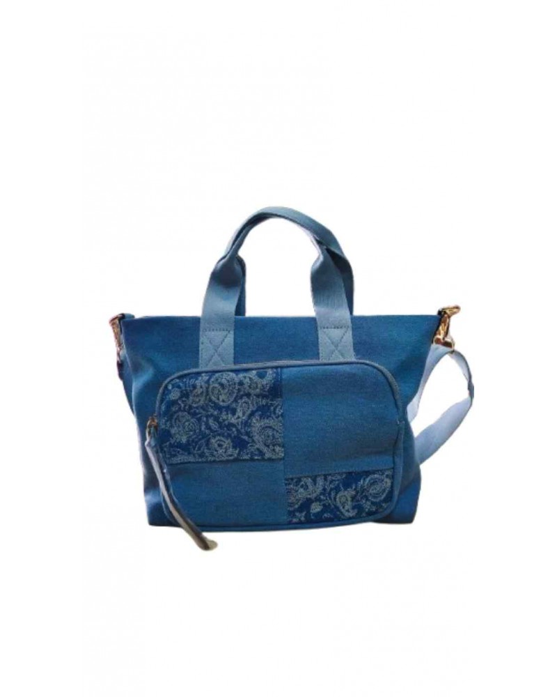 Bolso tipo bandolera de original diseño en patchwork de tejido vaquero a dos tonos de azules. Doble asa. Múltiples bolsillos en el exterior e interior.