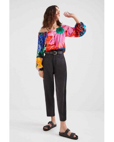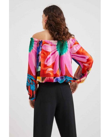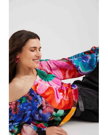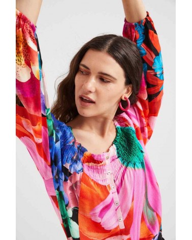 Cómodo cuello de barco elástico en nido de abeja en esta blusa de patch floral de M. Christian Lacroix. En manga larga y con botones para crear el escotado perfecto.