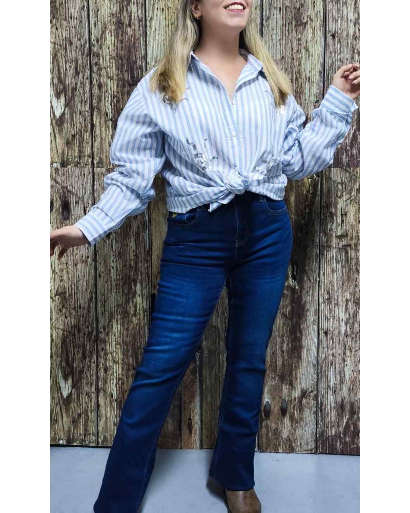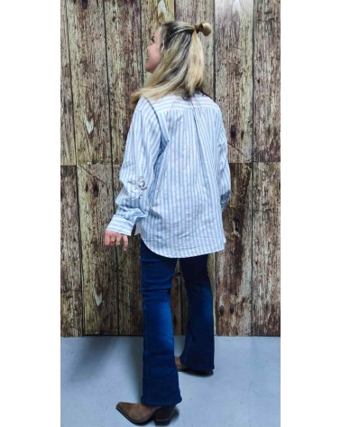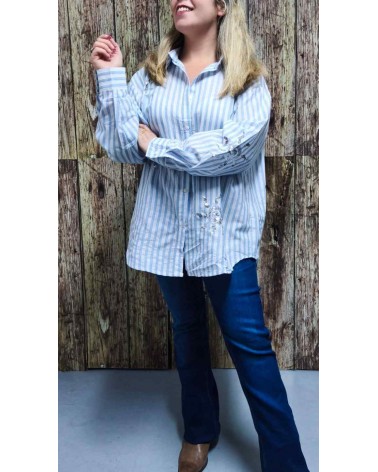 Camisa de mujer de estilo casual. Abotonada hasta abajo. Corte oversize. Tono celeste y blanco rayas verticales con fantasía de soles en lentejuelas plateadas. Ideal para combinar con tus jeans favoritos.