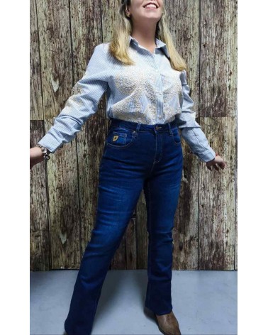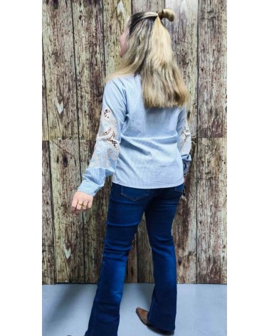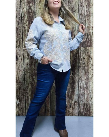 Blusa de mujer de estilo casual. Cuello camisero. Abotonada hasta abajo. Tono celeste a rayas con fantasía bordada y calada a contraste en el pecho y mangas. Tejido muy flexible y cómodo.