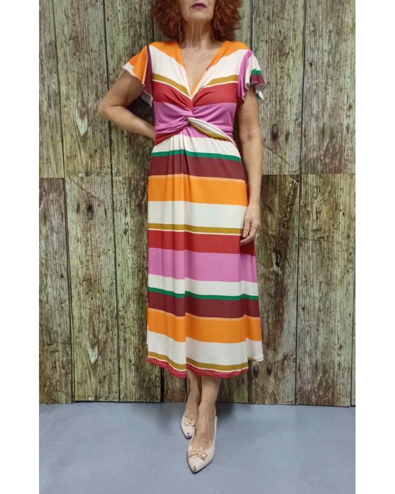Vestido de estilo casual de la firma LAGARS. Manga corta con volante. Escote en V terminado en un entrelazo con un corte en la cintura. Abre sutilmente en evasé. Tejido muy cómodo y adaptable al cuerpo.