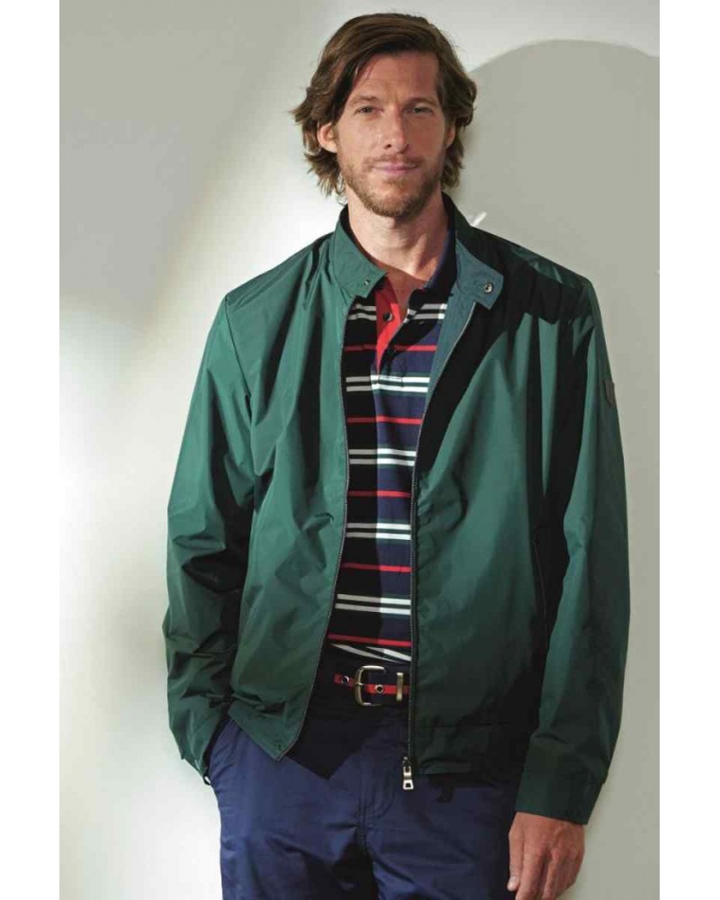 Cazadora hombre MCM tipo bomber. Reversible: En tono verde liso por una cara y de fanatasía discreta por la otra. Cuello Mao. Cierre frontal con cremallera y bolsillos en ambas caras. Tejido ligero y muy cómodo.