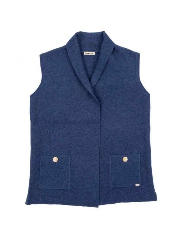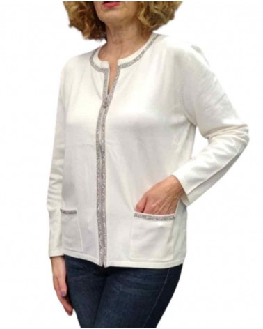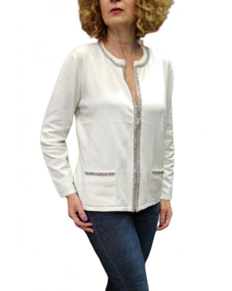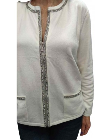 Chaqueta en punto de manga larga, en tono blanco roto. Cierre con cremallera, cuello caja y bolsillos delanteros, con detalles en pedrería plateada en su contorno, dando un toque de fiesta a la prenda.