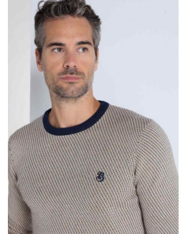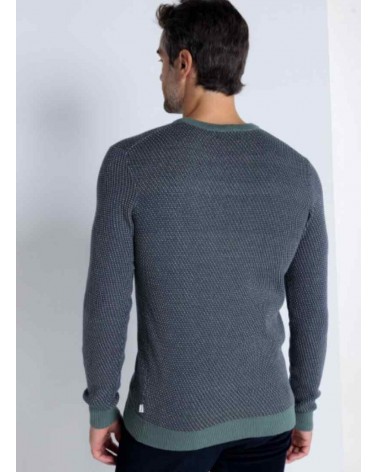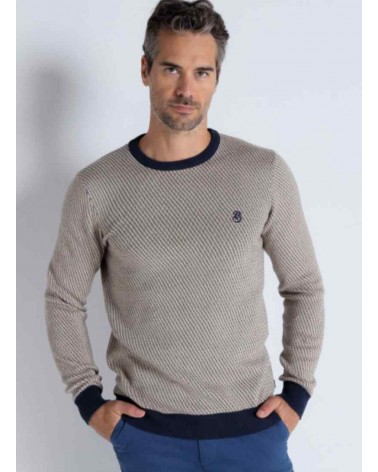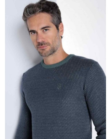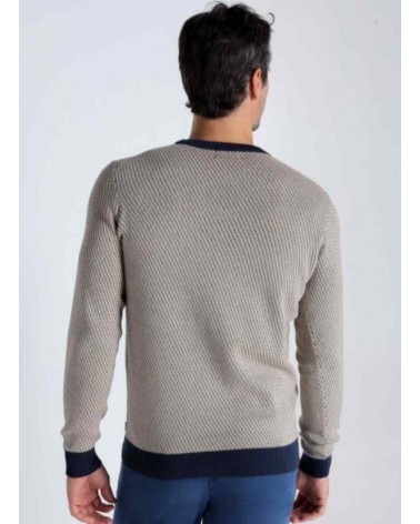 Jersey hombre BENDORFF de punto intarsia con fantasía de mezclillas a varios tonos. Cuello, puños y bajo a contraste. Cuello redondo. Manga larga. Tejido de algodón.