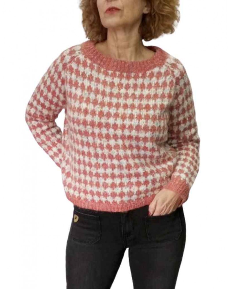 Jersey de punto grueso, estampado en fantasía difuminada en pata de gallo. Cuello redondo. Manga ranglan. Tejido muy cálido y confortable.