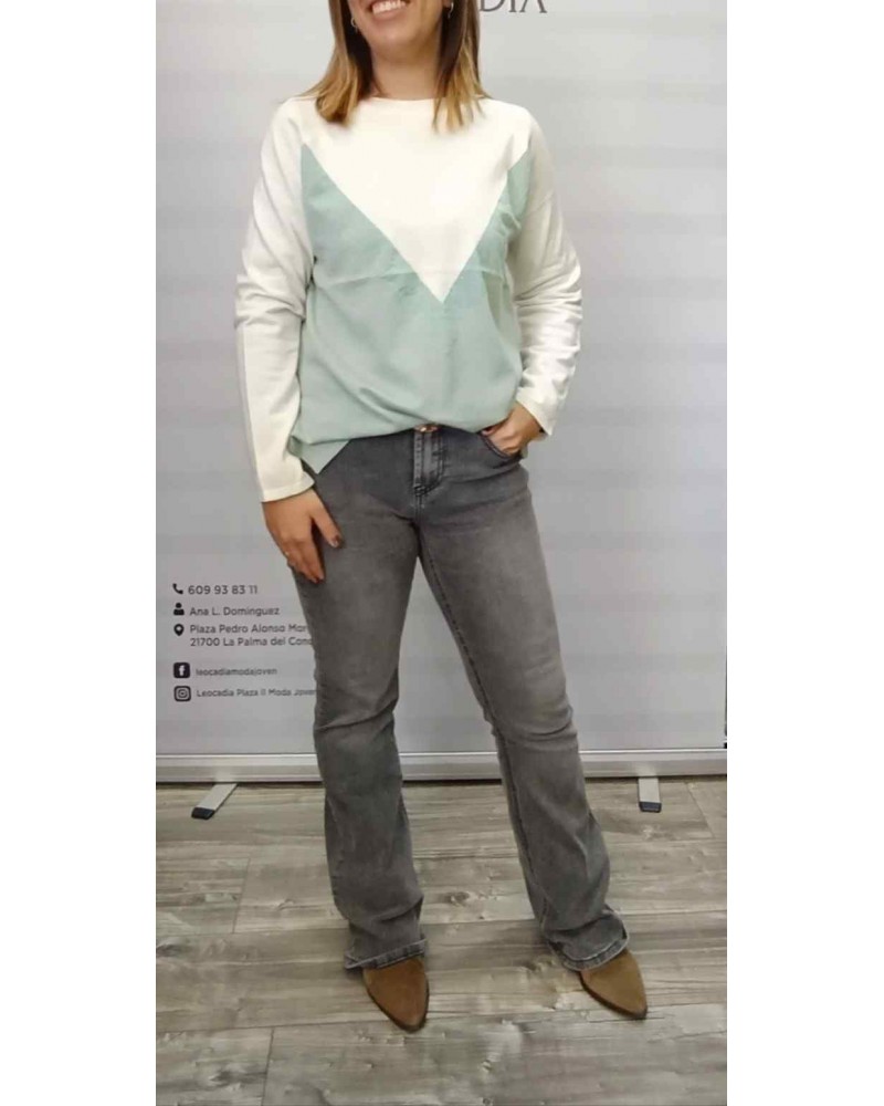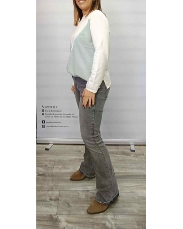Suéter de mujer en punto fino, cuello caja, corte recto, bicolor en tonos suaves y muy agradables. Aberturas laterales. Ideal para comenzar con looks primaverales.