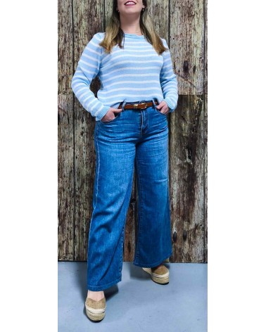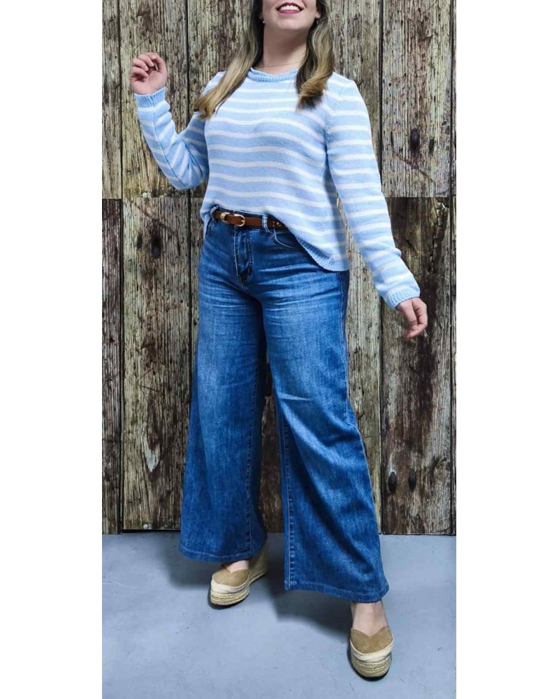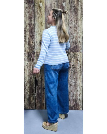 Jersey mujer en hilo, con cuello redondo, mangas largas y fantasía rayada bicolor en tonos muy primaverales, ideal para combinar con unos vaqueros.