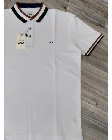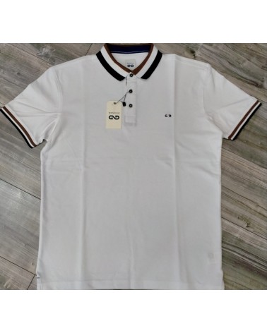 Polo liso, blanco con con fantasía listada en el cuello a juego con el remate de la manga, botones metálicos, aberturas laterales . Comp. 100% Alg.