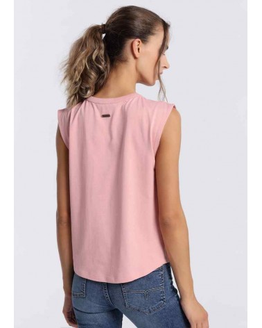 Camiseta LOIS mujer, manga en siza, cuello caja, en tono rosa liso, con logo frontal degradado.