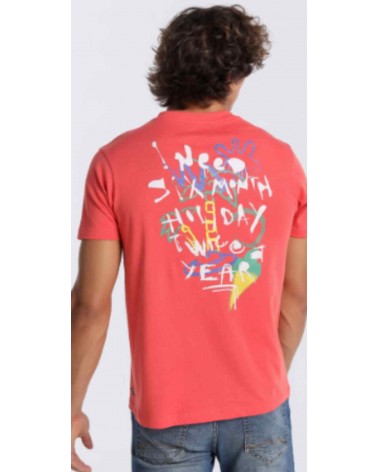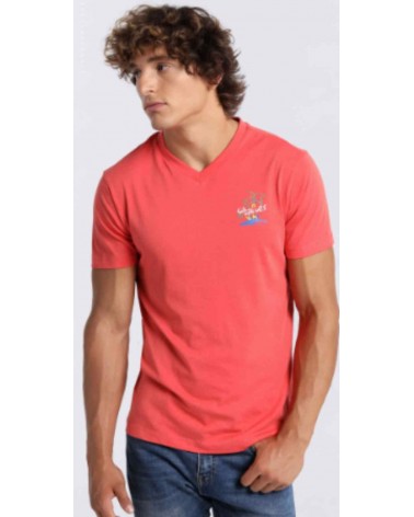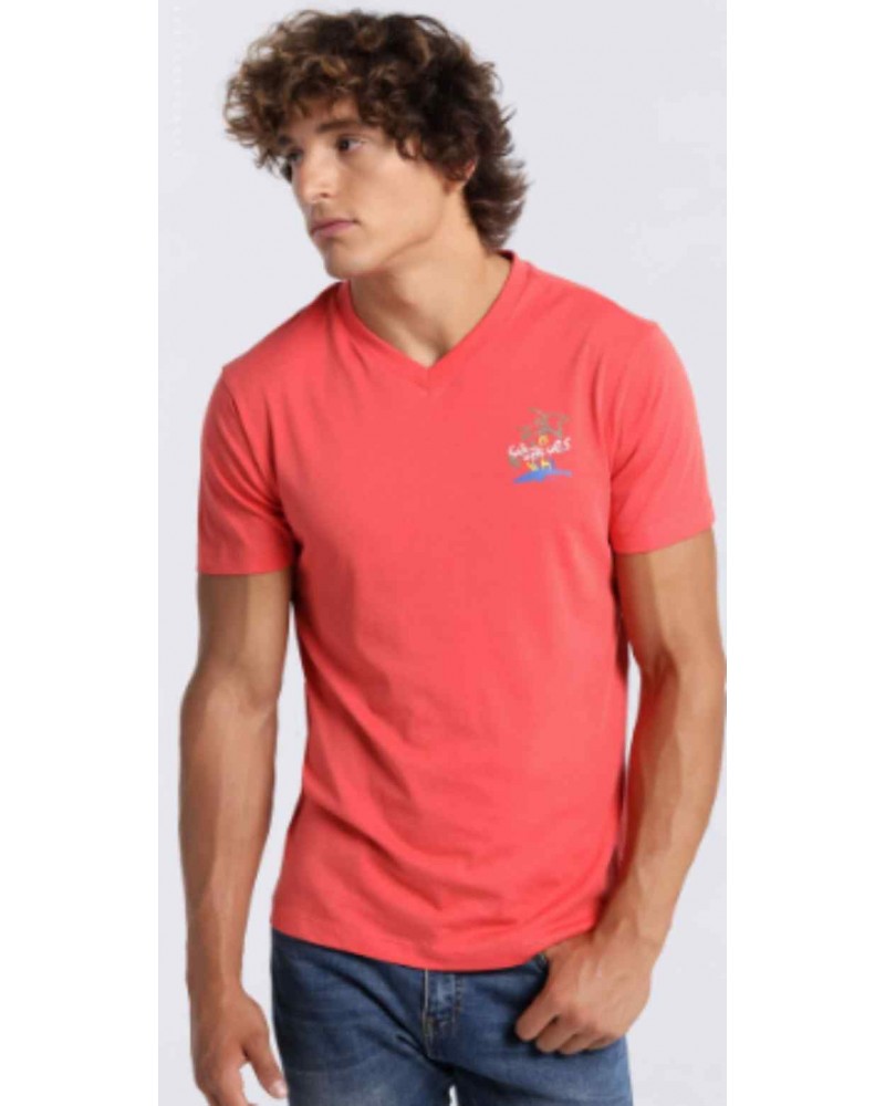 Camiseta SIX VALVES manga corta, cuello pico, en tono liso con un pequeño dibujo de motivo veraniego en el pecho, y mayor en la parte trasera. Tacto algodón muy suave.