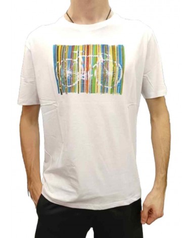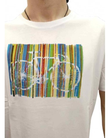 Camiseta de manga corta y cuello redondo. Detalle de fantasía estampada en la parte delantera de bicicleta a rayas.