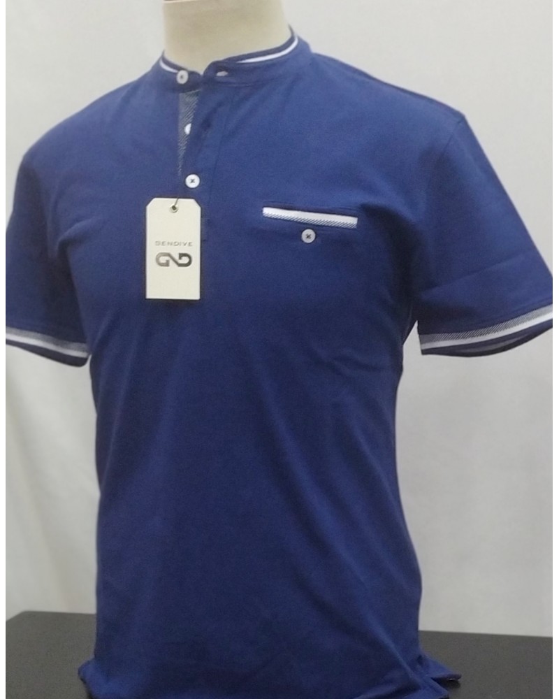 Polo liso piqué, cuello Mao. Destaca como fantasía vivos en otro tono en cuello, mangas y bolsillo. Comp.: 100% Alg. Moda Gallega