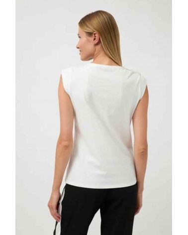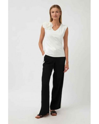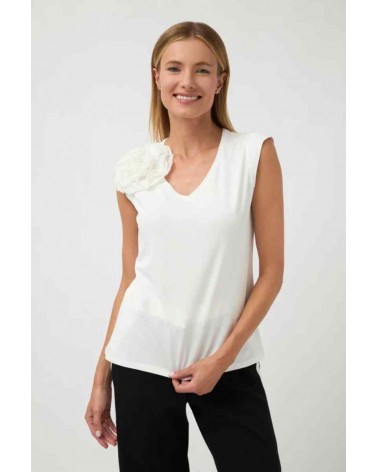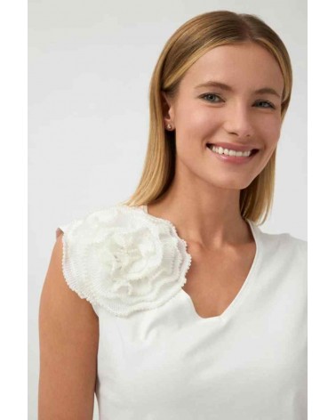 Camiseta de mujer de la firma BARILOCHE. Escote redondo. Manga con hombro caído con detalle de flores de tul que cubre un hombro. Bajo recto. Diseñado y fabricado en España.