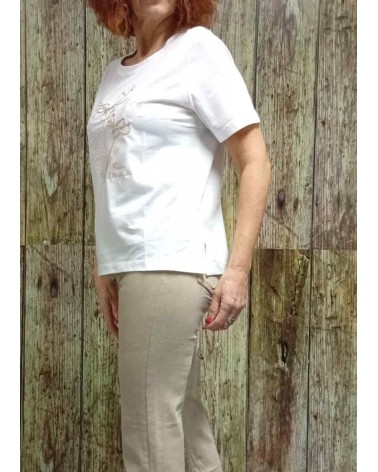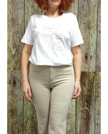 Camiseta en mangas cortas, en tono liso con detalles en la delantera bordadas a contraste, corte recto con aberturas laterales. Tejido de gran calidad muy finoy ligero.
