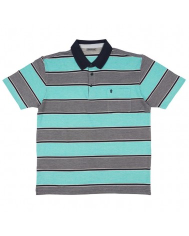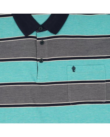 Polo manga corta con bolsillo y con listas jaspeadas combinando el vistoso tono verde agua con el elegante azul marino. Lleva remate en el mismo tono en vivos, mangas y cuello. Tejido muy fresco y ligero.