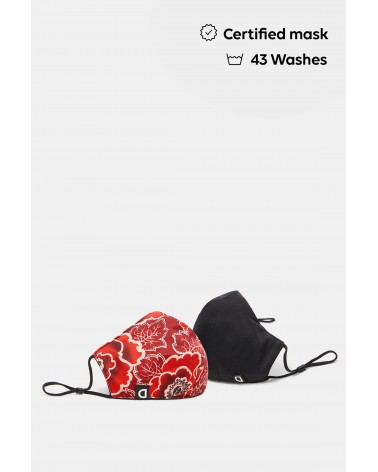 Mascarilla Unisex reversible, con un bolsito a juego. Estampado rojo con flores japonesas/negra lisa en la otra cara. Con sistema de ajustes laterales. Llamativa, fresca, versátil y cómoda. Cerfitifaca por la E.U. Antibacteriana. Lavables 43 Lavados.