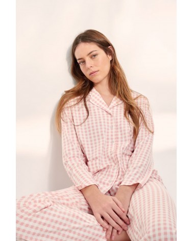 Este pijama camisero Vichy se compone de dos piezas de manga y pantalón largos confeccionadas en 100% algodón. Camisa con bolsillos de plastón, cuello con solapa y botones de nácar natural. Pantalón con goma elástica en la cinturilla para una sujeción perfecta.
