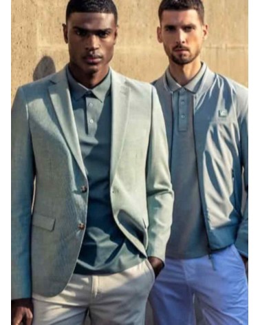 Chaqueta americana de hombre de la firma GENDIVE. Tejido ligero, de gran calidad y forrado en su interior. Bolsillo tipo sastre en la parte del pecho y dos tapetas en la parte inferior. Color verde agua muy actual y en tendencia.