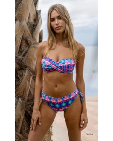 Bikini MARIE CLAIRE juvenil de estampado muy alegre y vistoso. Sujetador bandeau con aro y relleno. Banda silicona en el contorno para mayor sujeción. Tirantes multiposición. Fabricado en España.