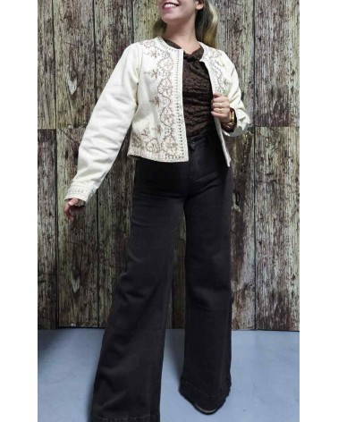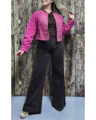 Pantalón vaquero de mujer. Corte alto. Pata ancha. Bolsillos delanteros y traseros. Tejido licrado muy cómodo y adaptable al cuerpo.