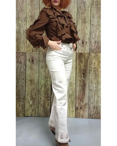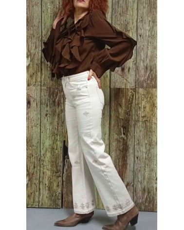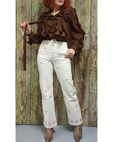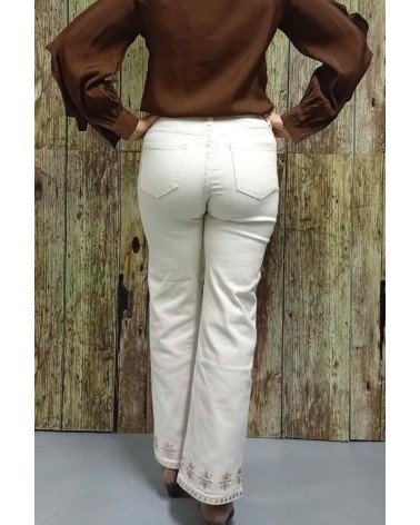 Pantalón vaquero de mujer de talle alto y corte recto. Fantasía bordada a contraste destacando la parte baja. Bolsillos delanteros y traseros. Tejido con elástico adaptable al cuerpo y de gran comodidad.