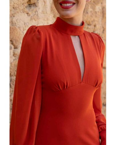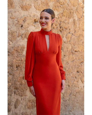 Vestido de la firma INVITADA PERFECTA de la línea eventos. Escote en V con tirilla al cuello y abotonada por detrás. Manga larga en gasa con puño. Corte debajo del pecho con pinzas. Falda entallada realzando la silueta. Largo midi. Cierre con cremallera trasera. Forro interior.