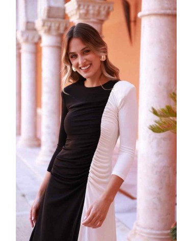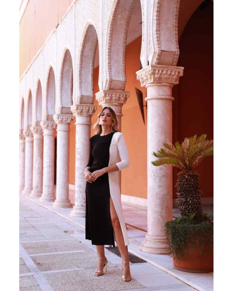 Vestido de la línea eventos de la firma CAYRO. Escote redondo. Mangas al codo y hombreras. Corte entallado fruncido en un lateral terminando en raja. Cremallera trasera invisible. Tejido bicolor licrado muy cómodo y adaptable al cuerpo. Forro interior.