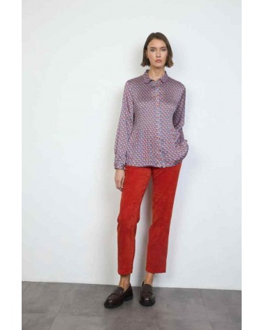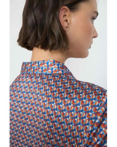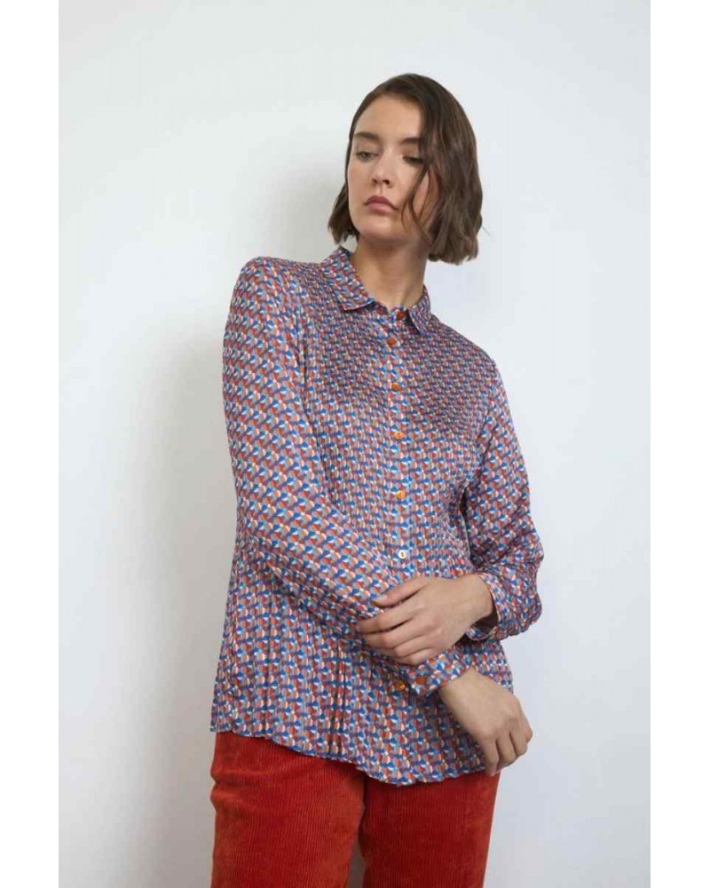 Blusa fluida plisada, de mujer con estampado geométrico. Cuello camisero con escote en V. Diseño entallado. Manga larga y puño con cierre de botón. Cierre frontal con botones efecto nácar. Bajo recto.
