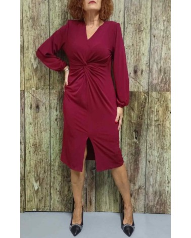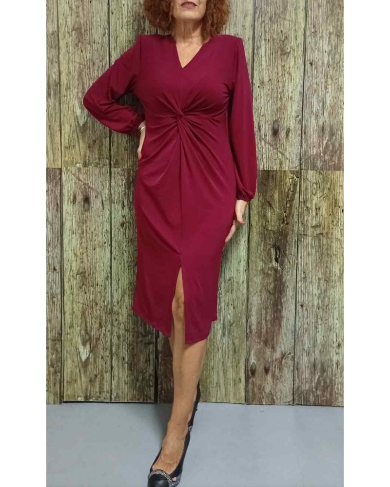 Vestido mujer de la firma Blanco Azahar de vestir. Escote en V. Manga larga abullonada terminada en elástico. Corte debajo del pecho con detalle de nudo. Largo midi con raja delantera.