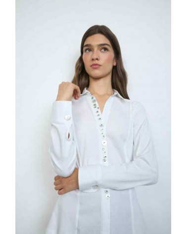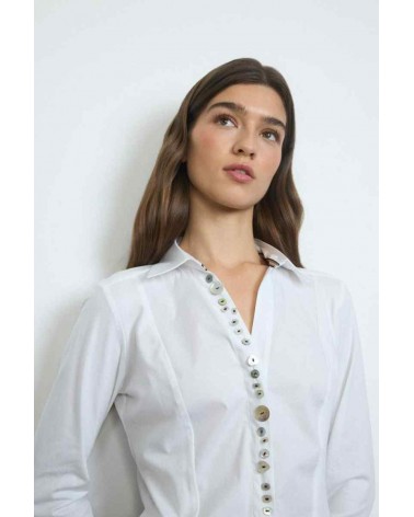 Camisa blanca de mujer en algodón. Cuello camisero con escote en pico y detalle de botones decorativos. Cierre frontal con botones ocultos por tapeta. Diseño entallado en mezcla de tejidos; parte frontal en tejido calado combinado con espalda y mangas en tejido de punto elástico para mayor confort y adaptabilidad de la prenda. Manga larga acabada en puño con cierre de botón. Bajo ligeramente redondeado. Diseñada y fabricada en España. Comp.: 96% algodón, 4% algodón