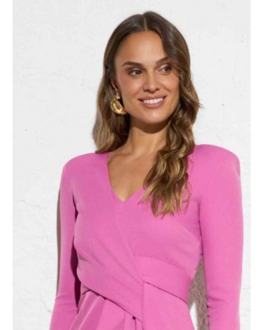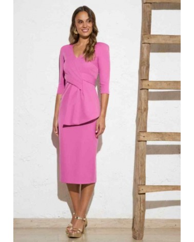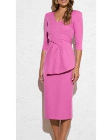 Vestido mujer de eventos de la firma ROLE. Escote en pico. Mangas francesas. Largo midi y corte recto. Detalle de maxi lazo delantero que disimula la zona abdominal y realza la figura. Cierre con cremallera invisible. Forro interior.