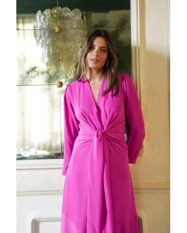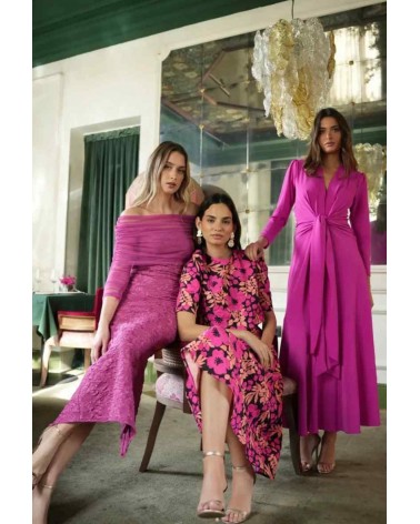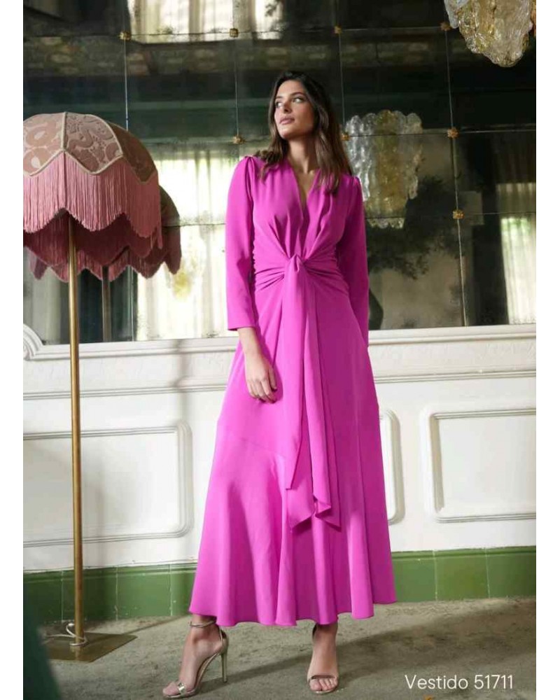 Vestido de la linea eventos de la firma CAYRO. Confeccionado en tejido crepe de alta calidad, con un largo midi que estiliza la figura. Su lazada en la cintura realza la silueta, mientras que el escote en V, las hombreras y el bajo con vuelo aportan feminidad, movimiento y elegancia al conjunto. Fabricado en España con tejidos de alta calidad.