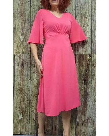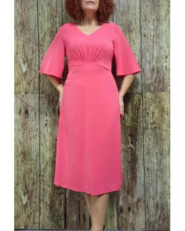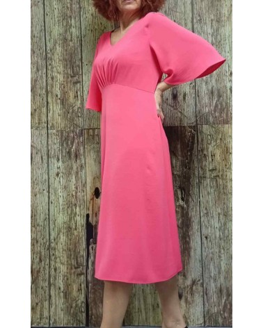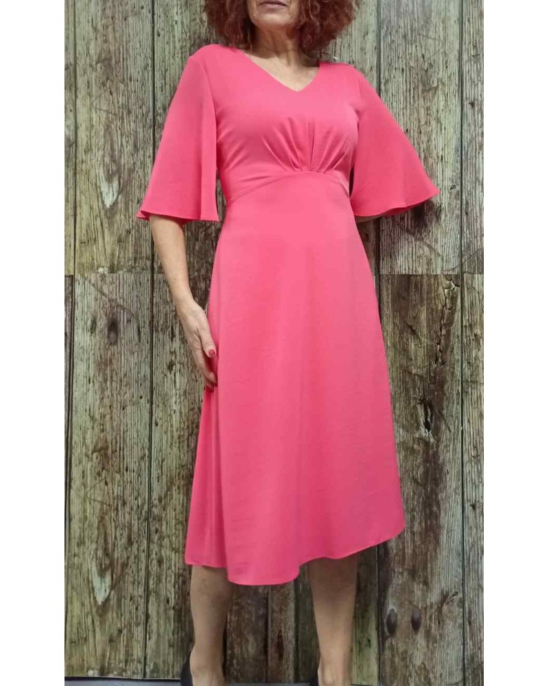 Vestido en tono liso muy versátil, con mangas francesas, escote en pico, corte alto de cintura con pliegues al pecho. Parte baja en evasé muy favorecedor. Tejido con mucha Caída. Cierre trasero con cremallera.