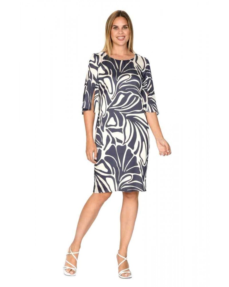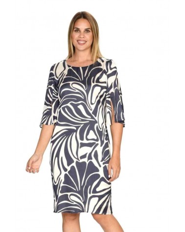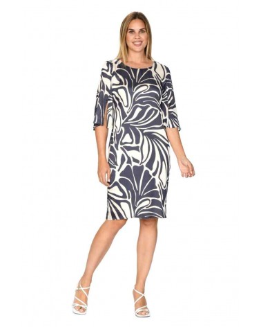 Vestido de la línea vestir de la firma RAGUSSA CLASSIC. De elegante estampado bicolor. Escote a la caja con detalle de brillo en su contorno. Mangas al codo con aberturas. Corte recto con mucha caída, tejido muy ligero y fluido. Cierre lateral con cremallera.