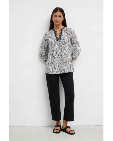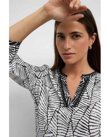 Blusa de mujer de la firma TINTA Y BARILOCHE de manga tres cuartos. Cuello mao. Detalles de estampado de hojas en blanco y negro con ribete de pasamanería en el cuello. Escote en V. Bajo recto. Diseñada y fabricada en España.