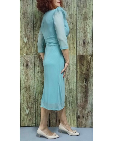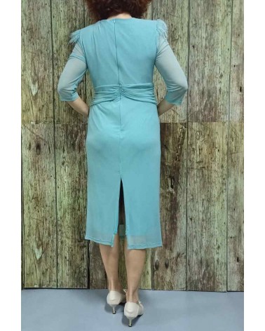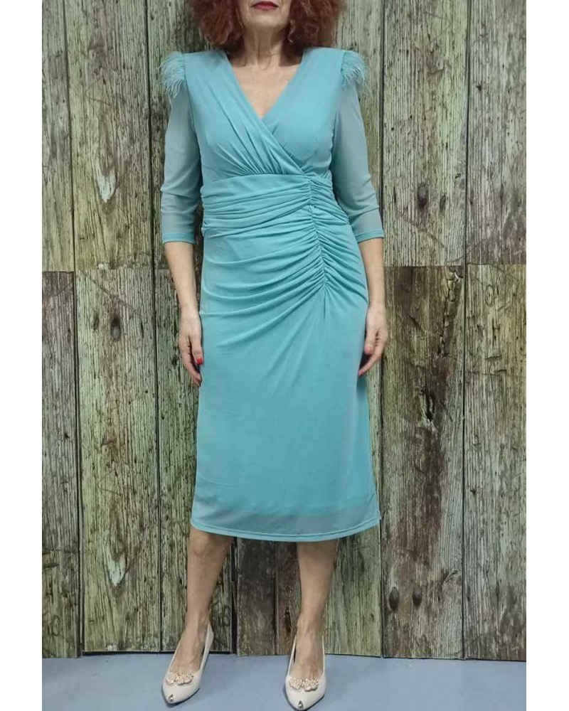 Vestido de la linea eventos. Escote en pico. Mangas al codo con transparencia. Pronunciadas hombreras con plumas. Corte fruncido en un lateral. Cremallera trasera invisible. Forro interior.