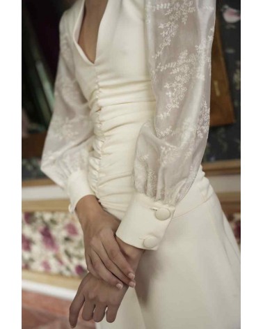 Vestido de invitada. Diseño elegante y confeccionado en tejido bioelástico con voile bordado, aportando comodidad y una caída sutil. Su drapeado central, corte a la cadera y escote en V estilizan la silueta, mientras que la cremallera trasera y el forro interior garantizan un ajuste perfecto.