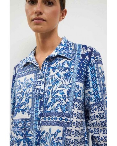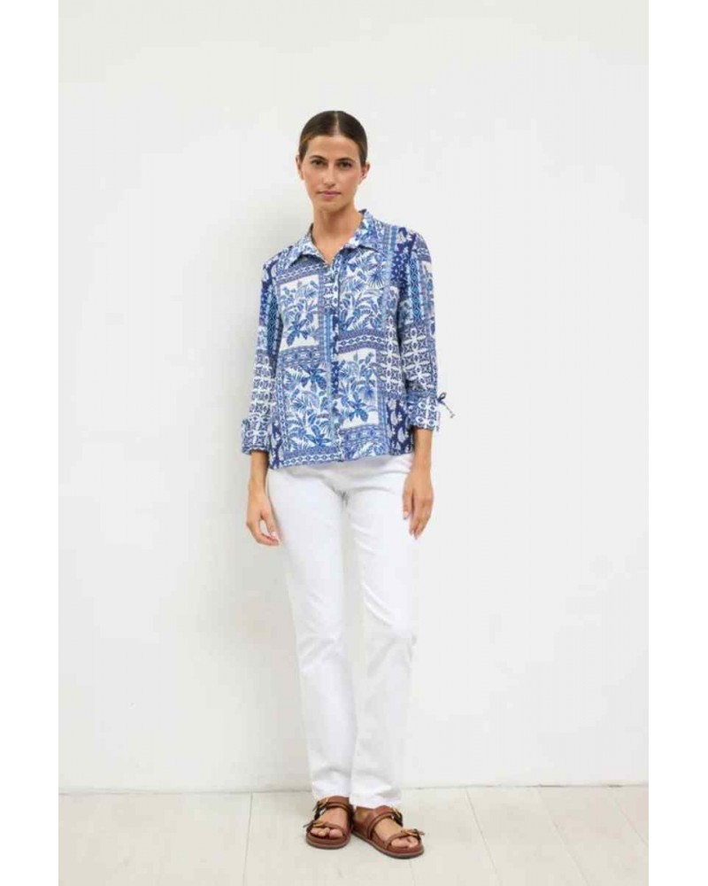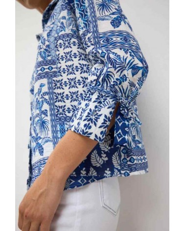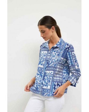 Camisa de mujer de la firma TINTA Y BARILOCHE de manga larga con detalle de lazada en los puños. Cuello camisero. Estampado étnico y vegetal tipo mosaico. Cierre frontal de botones. Bajo recto.