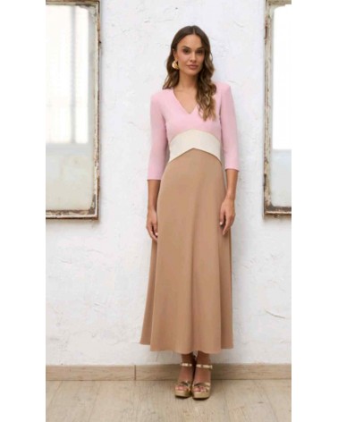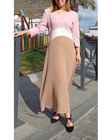 Vestido de la firma ROLE de la línea de evento joven. En tono liso con un original diseño en franjas tricolor degradado en colores. Largo Midi, mangas francesas y cuello en pico. Corte entallado en la parte superior y abriendo en evasé. Cierre trasero con cremallera invisible.