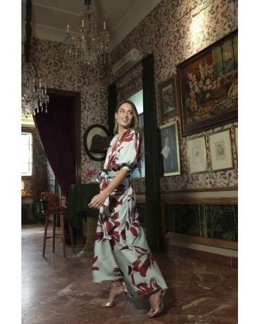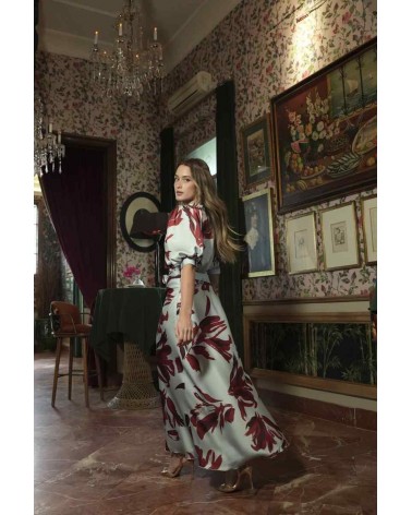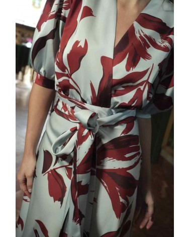 Vestido de invitada elegante, perfecto para comuniones, bautizos y bodas. Confeccionado en tejido de raso, destaca por su escote cruzado, estampado con base en color celeste, cremallera lateral discreta, lazada que realza la cintura y hombreras que estilizan la silueta de manera natural.