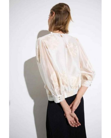 Blusa de mujer de la firma TINTA Y BARILOCHE. Manga larga abullonada con puño ancho. Cuello redondo. tejido jacquard con relieve floral texturizado y semitransparencias. Escote redondo. Bajo recto con banda ancha. Diseñado y fabricado en España.